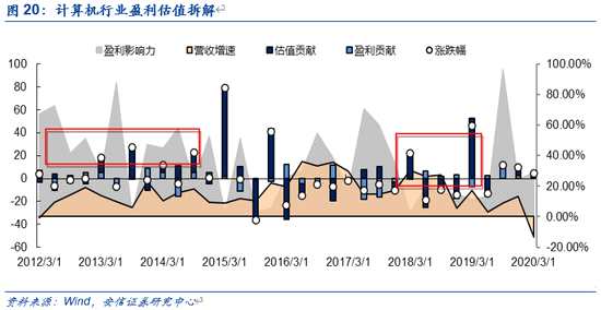 ■對(duì)于計(jì)算機(jī)而言,2012年至2014年期間盈利影響力始終保持高位,結(jié)合其不斷提升的業(yè)績(jī)表現(xiàn),得以領(lǐng)漲。而后在17-18年的下跌中,其營(yíng)收不斷下滑,同樣注重盈利影響力的環(huán)境中,股價(jià)不斷下滑。