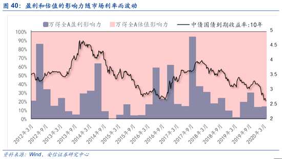 利用盈利影響力這一項(xiàng)指標(biāo),基本面增速和估值水平背離的現(xiàn)象就不難解釋了:盈利影響力的變化反映了市場(chǎng)環(huán)境的變化,盈利影響力較高的時(shí)期,盈利較好的行業(yè)上漲,表現(xiàn)為估值和盈利的同向變化;盈利影響力較低的時(shí)期,市場(chǎng)情緒和預(yù)期的影響更大,則容易出現(xiàn)盈利和估值的背離。