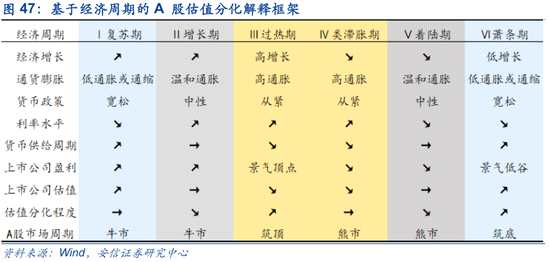 過(guò)熱期:企業(yè)盈利見(jiàn)頂,利率繼續(xù)上行,此時(shí)市場(chǎng)由盈利主導(dǎo),前期估值過(guò)高但未兌現(xiàn)為企業(yè)盈利的行業(yè),估值出現(xiàn)回落,而績(jī)優(yōu)股繼續(xù)推動(dòng)市場(chǎng)上行。估值分化再次出現(xiàn)。