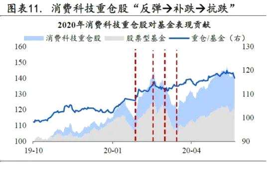 機(jī)構(gòu)配置行為:2020年一季度,受疫情沖擊,市場下跌,科技、消費板塊配置比重分別從19.2%、39.1%增至23.7%、40.3%。