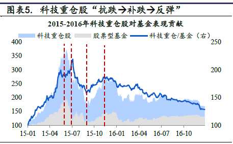 抗跌階段:2015年6月15日至7月8日,初期機(jī)構(gòu)投資者加倉,科技重倉股組合下跌29%,優(yōu)于股票型基金整體跌幅39%。