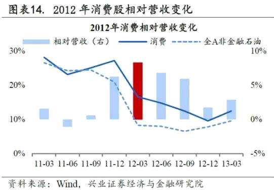 從板塊盈利來看,2012年一季度至2012年四季度,消費板塊營收增速從16.6%降至9.6%,全A非金融石油營收增速從8.3%降至7.8%,消費板塊相對全A非金融石油營收從8.3%收窄至1.7%。