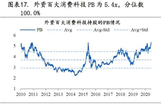 2019年下半年以來,市場再次形成“消費+科技”的機(jī)構(gòu)抱團(tuán),以外資百大消費科技持股作為國內(nèi)核心資產(chǎn)的代表,其PB和PE估值均達(dá)到歷史98.9%、100%分位數(shù)水平,類似2015年5月、2018年1月、2019年4月、2020年1月。