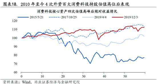 2010年至今,消費科技核心資產(chǎn)主要4次來到估值高位,后續(xù)消費科技核心資產(chǎn)組合3次回調(diào),最近1次震蕩。2010年至今,外資百大消費科技持股PB估值突破前20%的高位,主要包括4次,分別為:2015年5月21日、2017年10月25日、2019年4月4日、2019年12月3日。