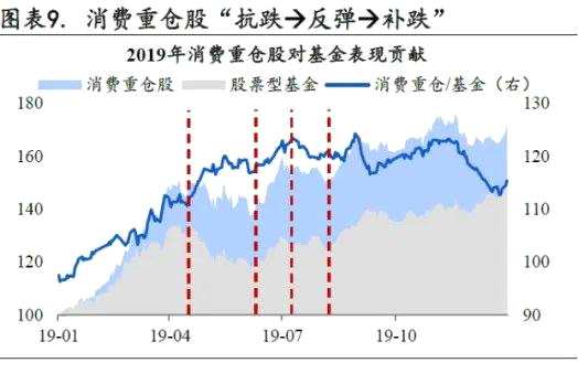 機(jī)構(gòu)配置行為:2018年一季度,市場持續(xù)下跌,基金仍在二季度加倉消費板塊,配置比例從35.5%升至43%。2019年一季度,大盤觸底反彈,基金再度加倉消費,配置比例從36.1%升至40.7%。