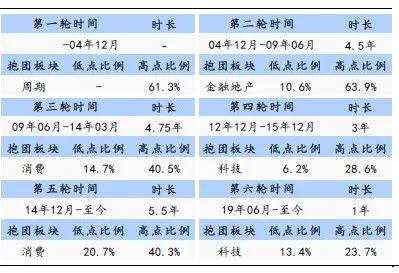 6)2019年6月至今,科技抱團(tuán),時長1年,配置比例從13.4%提升至23.7%。2019年下半年以來,科技制造行業(yè)迎來5G、新能源等新產(chǎn)業(yè)周期,國家對于創(chuàng)新支持亦達(dá)到前所未有的力度,科創(chuàng)板開板、創(chuàng)業(yè)板實施注冊制、新三板精選層改革、再融資、重組等政策放開,形成風(fēng)險偏好與基本面的雙擊。