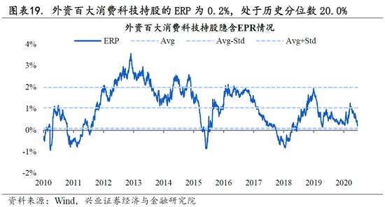 我們以2020年一季度基金和外資數(shù)據(jù)構(gòu)建外資百大消費科技持股組合,作為國內(nèi)“消費+科技”核心資產(chǎn)代表,考察該組合自2010年至今的估值水平: