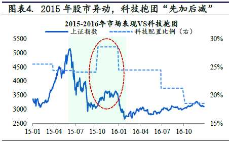機(jī)構(gòu)配置行為:2015年二季度末和三季度初,證監(jiān)會清理場外配資,市場大幅下挫,但三季度期間基金仍然加倉科技,科技配置比重從24.1%升至28.6%。