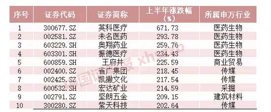 剔除次新股后,英科醫(yī)療、未名醫(yī)藥、奧翔藥業(yè)、振德醫(yī)療、王府井、省廣集團(tuán)、凱撒文化、宏達(dá)礦業(yè)(維權(quán))、【堅(jiān)朗五金(002791)、股吧】、紫天科技位列上半年漲幅榜前十。