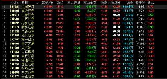 盤面上,券商股持續(xù)領漲,中字頭股票全線爆發(fā)。浙商證券,中泰證券、中國銀河、國金證券、山西證券、招商證券、中銀證券等漲停。