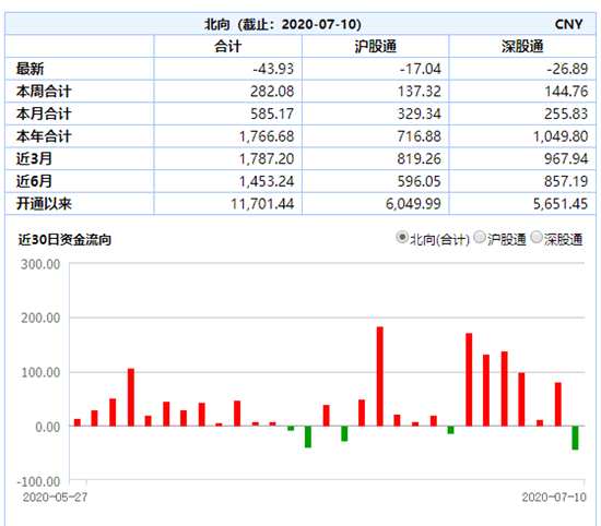 Wind數(shù)據(jù)顯示,7月10日,北向資金全天凈流出43.93億元,打破了此前連續(xù)六個交易日凈流入的態(tài)勢,其中滬股通凈流出17.04億元、深股通凈流出26.89億元。