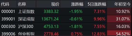 Wind數(shù)據(jù)顯示,上證指數(shù)終結(jié)日線八連陽,跌1.95%,報3383.32點;深證成指跌0.61%,報13671.24點;創(chuàng)業(yè)板指漲0.75%,報2778.46點。從全周表現(xiàn)看,三大股指分別上漲7.31%、9.96%、12.83%。