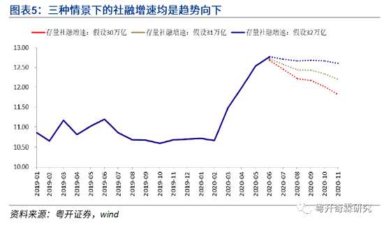 我們假設了全年社融新增30萬億、31萬億、32萬億三種情景,發(fā)現(xiàn)三種情景下,社融存量增速無一例外,都是趨勢向下。