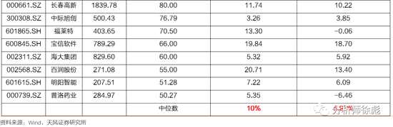 從目前已發(fā)布的中報預報中,按照天風分類行業(yè)劃分,我們梳理了目前發(fā)布4家以上、中報預報增速中值大于40%發(fā)布個股比例超過一半的相關行業(yè),數據中心、工業(yè)物聯(lián)網、風電、農藥、飼料、醫(yī)療器械概念景氣度較高。