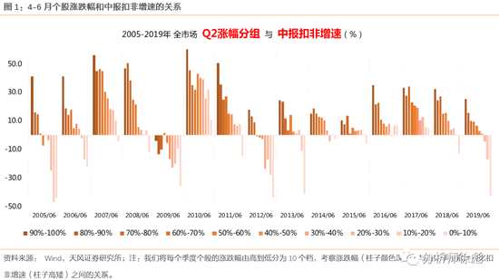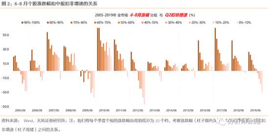 通過個股漲跌幅過去15年的回溯,我們發(fā)現,每年4-6月和6-8月,個股漲幅的排名,很大程度上與中報的扣非累計同比增速呈現一個比較好的正向相關性。