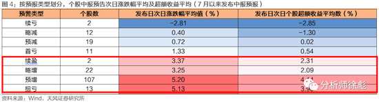 一方面,從業(yè)績預報類型來看,在中報預報發(fā)布后業(yè)績預喜個股表現更佳。我們選取預報時間在7月以來的個股,按照業(yè)績續(xù)虧、略減、預減、首虧、續(xù)盈、略增、預增、扭虧八組進行分類,我們可以顯著的看到,在圖4的紅色方框中,業(yè)績預喜的個股在發(fā)布的預報的次日,不管是絕對收益還是超額收益(相對于上證綜指)都遠勝業(yè)績較差的個股。