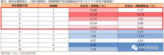 總體來看,環(huán)比增速排名靠前的個股,發(fā)布預告次日的漲跌幅平均及超額收益都要好于環(huán)比增速排名較后的組,如圖8中的紅色方框。而如果將時間維度拉長到一周來看,環(huán)比業(yè)績增速排名靠前的個股周度絕對收益與超額收益與排名靠后的組差距更加明顯,業(yè)績增速與個股表現的相關性進一步加強,如圖9中的方框。