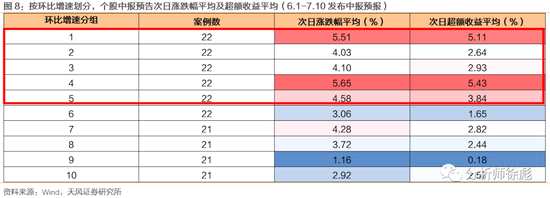 如果按照Q2環(huán)比增速從高到低分組,個股表現與Q2業(yè)績增速環(huán)比同樣存在相關性,且周度表現較日度表現更加明顯。我們將符合標準的個股,分成10組,環(huán)比增速前10%為第一組,以此類推,中報業(yè)績預報環(huán)比增速排名在90%-100%為第十組。