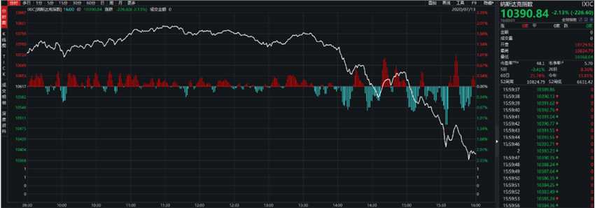 隔夜美股再現(xiàn)驚魂跳水一幕。納指盤中一度大漲2%,創(chuàng)歷史新高,但尾盤直線下挫,收盤跌超2%,創(chuàng)兩周來最差表現(xiàn)。標(biāo)普500高開逾0.6%,收跌0.94%,基本上抹平上周五漲幅。僅道指微幅收漲,漲幅0.04%。