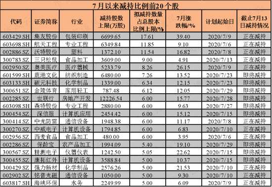 減持比例前三的為集友股份,航天工程,【沃特股份(002886)、股吧】;7月以來累計漲幅分別為39.4%,9.10%,16.82%。