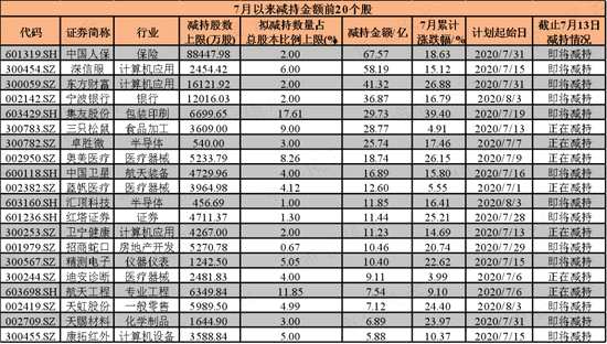 從這月減持個股來看,減持金額最多是中國人保,減持股數(shù)為88448萬股,占總股本比例的2%;按7月10日收盤價,估算減持金額約67.57億。計劃減持起始日為7月31日,7月以來累計漲幅18.63%,振幅35.71%。