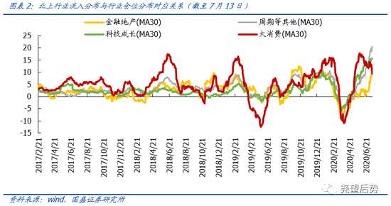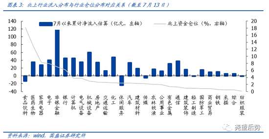 行業(yè)結(jié)構(gòu)上,我們同樣能看到,7月巨幅外資流入更多集中在非傳統(tǒng)重倉(cāng)板塊。北上持倉(cāng)結(jié)構(gòu)顯示,食飲、醫(yī)藥、家電、電子、銀行和非銀金融是北上資金的傳統(tǒng)重倉(cāng)行業(yè),這6大行業(yè)占北上總持倉(cāng)的60%左右,可以視為歷史上外資最偏愛(ài)的板塊。但據(jù)我們的統(tǒng)計(jì),7月以來(lái)入場(chǎng)的約650億增量資金中,僅有不足4成流入上述前6大行業(yè),相較之前的配置行為產(chǎn)生了明顯的偏移。其中,計(jì)算機(jī)、機(jī)械設(shè)備、化工凈流入均在40億以上,明顯超過(guò)了食飲、醫(yī)藥與家電的流入規(guī)模。