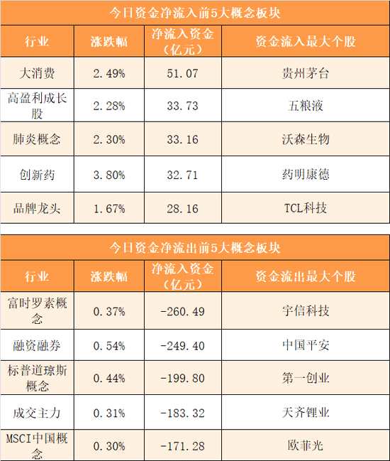 概念板塊方面,今日大消費(fèi)、高盈利成長(zhǎng)股、肺炎概念、創(chuàng)新藥等概念板塊資金呈現(xiàn)凈流入,其中大消費(fèi)概念凈流入51.07億元居首。