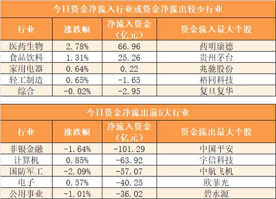 3、醫(yī)藥生物行業(yè)凈流入66.96億元居首