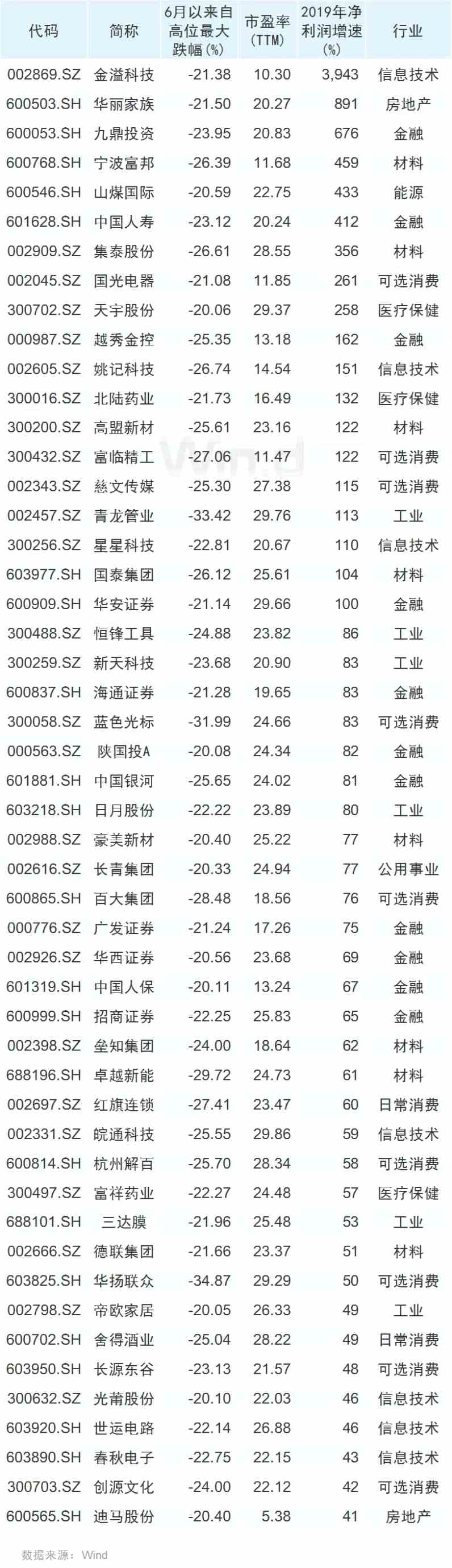除高股息率公司外,近期市場(chǎng)大幅波動(dòng),不少個(gè)股短線跌幅較大,對(duì)于部分低估值高成長(zhǎng)個(gè)股而言,短線下跌或給場(chǎng)外資金介入良機(jī)。Wind統(tǒng)計(jì)顯示,6月份以來,自高位跌幅超過20%,當(dāng)前市盈率低于30倍,且2019年凈利潤增速超過40%的公司有50家。其中,金溢科技、華麗家族、九鼎投資、寧波富邦、【山煤國際(600546)、股吧】、中國人壽、集泰股份、國光電器、天宇股份、越秀金控、姚記科技、北陸藥業(yè)等多家公司2019年凈利潤增速超過100%。