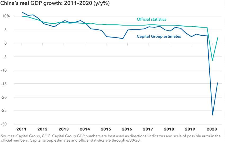 資料來源:資本集團(tuán),CEICGDP:我們的研究表明,一季度中國(guó)經(jīng)濟(jì)縮幅遠(yuǎn)高于官方6.8%的預(yù)期。雖然中國(guó)二季度發(fā)布的數(shù)據(jù)顯示,GDP年化同比漲幅達(dá)到3.2%,我還是認(rèn)為中國(guó)經(jīng)濟(jì)在2020年不會(huì)增長(zhǎng),這一點(diǎn)與買方對(duì)中國(guó)GDP適度增長(zhǎng)的普遍預(yù)期恰好相反。刺激計(jì)劃:隨著增長(zhǎng)受沖擊的程度變得越來越顯著,北京方面正推出一攬子小額財(cái)政激勵(lì)措施。不過別指望這些措施的金額會(huì)達(dá)到全球金融危機(jī)時(shí)的量級(jí)——最多占GDP的5%。相比之下,2008-2009全球信貸沖擊時(shí)這一比例達(dá)到10%。這仍將足以穩(wěn)定2020下半年的中國(guó)經(jīng)濟(jì),并為2021年的增長(zhǎng)提供一些支持——信貸發(fā)放通常需要12到18個(gè)月才會(huì)在整個(gè)經(jīng)濟(jì)中發(fā)揮作用。新基建:雖然很大一部分財(cái)政激勵(lì)將作用在基建領(lǐng)域,諸如升級(jí)電網(wǎng)、修建地鐵和城郊鐵路網(wǎng)以及改善環(huán)境,但北京方面還希望將一部分資金用于“新基建”領(lǐng)域,為5G通信網(wǎng)絡(luò)和數(shù)據(jù)中心的發(fā)展鋪平道路。