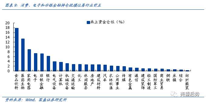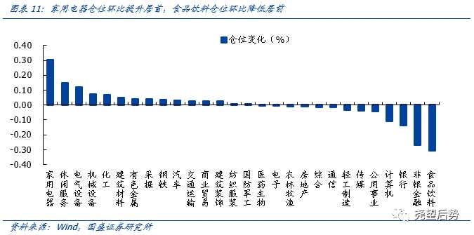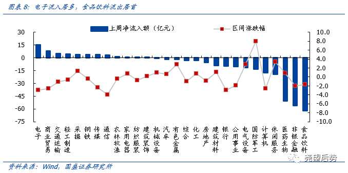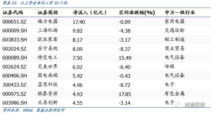 上周北上資金小幅流入電子,而集中流出食品飲料、非銀金融、醫(yī)藥生物等重倉行業(yè)。根據(jù)我們的測算,上周電子、商業(yè)貿(mào)易和交通運輸流入額居前,分別為14.88億、7.88億和4.56億;食品飲料、非銀金融和醫(yī)藥生物流出額居前,分別為-62.20億、-55.94和-50.72億。風格方面,創(chuàng)業(yè)板指/滬深300指數(shù)比較上周基本持平。從各行業(yè)持倉情況來看,家用電器和休閑服務倉位提升居首,倉位分別提升0.30%和0.15%,同時食品飲料和非銀金融倉位回落居多,倉位下降0.30%和0.27%。