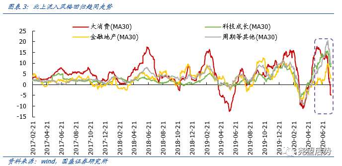 經(jīng)歷近期持續(xù)離場,北上交易盤占比已回落至6月底水平,后續(xù)大進大出有望趨于平穩(wěn)。據(jù)我們的統(tǒng)計,7月快速提升的交易型資金占比已經(jīng)出現(xiàn)明顯回落,資金結(jié)構(gòu)也已經(jīng)大致回歸至6月底水平,交易型資金主導的大進大出有望告一段落。此外,結(jié)合北上資金流入風格調(diào)整看,7月周期+金融大幅流入的風格也陸續(xù)出現(xiàn)拐點,北上流動風格重回消費主導,北上流入風格有望回歸。未來,長線配置資金仍將是北上長期主力,“水往低處流”仍將是外資配置A股的長期趨勢,繼續(xù)看好下半年千億級別的外資增量。