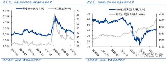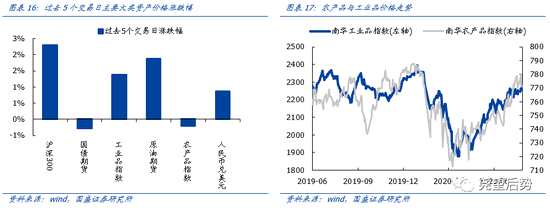 股市方面,過去5個交易日滬深300指數(shù)上漲2.29%,標普500風險溢價與VIX指數(shù)有所下行;萬得全A口徑下的修正風險溢價水平回落,截至周四下行至0.21%。大宗商品方面,截止至周四,國內(nèi)原油期貨上漲1.87%;工農(nóng)業(yè)產(chǎn)品走勢分化,工業(yè)品上漲1.38%,農(nóng)業(yè)品下跌0.20%;過去5個交易日NYMEX原油上漲4.07%,收于41.97美元/桶,倫敦黃金現(xiàn)價大漲5.46%,收于2063美元/盎司;債市方面,美債長端不變短端回升保持穩(wěn)定,十年期國債期貨過去5個交易日下跌0.27%,中美利差攀升;匯市方面,人民幣回升,過去5個交易日上漲0.86%,美元兌離岸人民幣收于6.94。