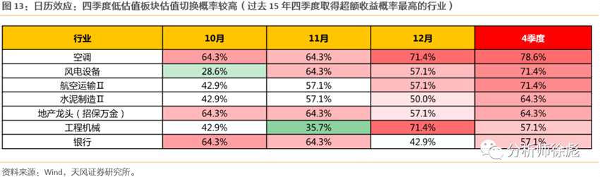 歷史經(jīng)驗來看,由日歷效應(yīng)引發(fā)的低估值板塊的估值切換往往在四季度最明顯。概率上,金融、穩(wěn)定及部分早周期板塊在四季度表現(xiàn)較佳,核心邏輯在于這些低估值板塊對來年業(yè)績穩(wěn)健增長的預(yù)期。反之,如果對來年宏觀經(jīng)濟形勢較悲觀,像2008年、2011年、2013年、2018年四季度,藍(lán)籌估值切換的行情就不明顯。