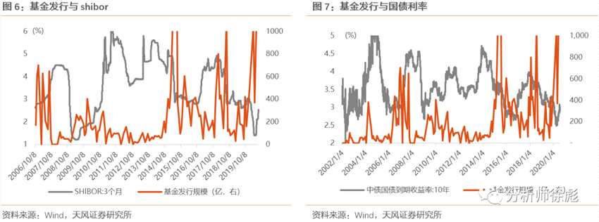(1)一方面,公募發(fā)行規(guī)模受流動性環(huán)境影響,需要貨幣或信用寬松作為支撐。歷次基金發(fā)行高峰(金麒麟分析師)都出現(xiàn)在SHIBOR快速下行階段或者歷史底部, 06年初、09年初、14年底、18年初、20年上半年,無一例外。而下一階段更可能的情形是貨幣維持、信用走平,或意味著對基金發(fā)行的支撐動力減弱。