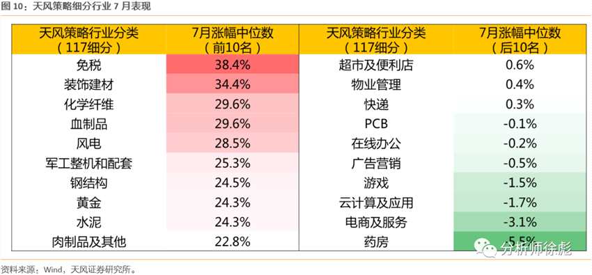 7月全月來看,市場仍然是少部分公司的牛市,在天風(fēng)策略行業(yè)分類下的117個細(xì)分板塊中分化極大,70%的行業(yè)跑輸wind全A,結(jié)構(gòu)性特征顯著。