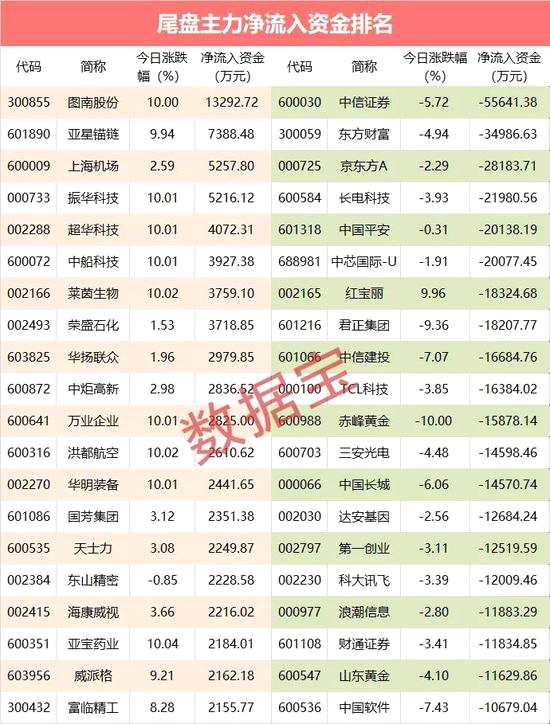 從個(gè)股方面看,4股尾盤(pán)主力資金凈流入超5000萬(wàn)元,分別是【圖南股份(300855)、股吧】、亞星錨鏈、上海機(jī)場(chǎng)、振華科技,其中圖南股份尾盤(pán)主力資金凈流入1.33億元居首,股價(jià)今日漲停,該股已連續(xù)5個(gè)交易日獲得主力資金凈流入。亞星錨鏈尾盤(pán)資金流入7000余萬(wàn)元,今日放量漲停。