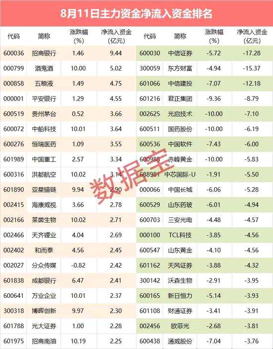 個(gè)股方面,56股主力資金凈流入超億元。其中招商銀行凈流入9.44億元,資金流入規(guī)模居首,股價(jià)上漲1.46%。成都銀行上漲6.46%,資金凈流入2.41億元。