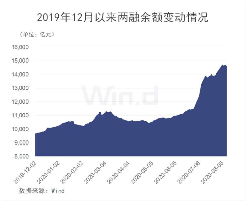 Wind數(shù)據(jù)顯示,截至8月12日,A股融資融券余額為14602.6億元,較前一交易日的14636.77億元減少34.17億元。而6月30日時,兩融余額僅為11637.68億元,7月以來,累計增長約3000億元。