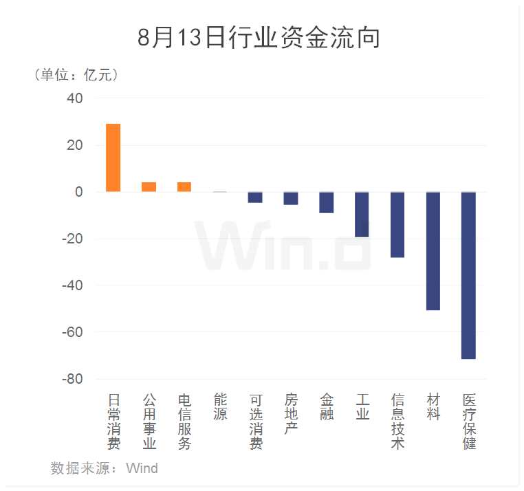 從8月13日行業(yè)資金流向來看,主力資金凈流出150多億元,多數(shù)板塊資金凈流出。其中,日常消費板塊凈流入金額最多,超過20億元;而醫(yī)療保健板塊凈流出超70億元,位居首位;此外,材料、信息技術等板塊資金凈流出額均超過20億元。