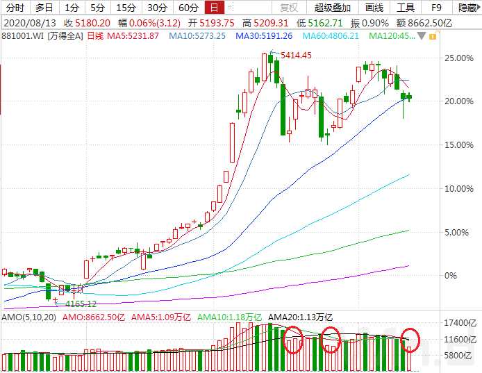 市場縮量調整,8月13日,萬得全A成交金額僅8662多億元,本輪調整首次跌破萬億關口,而從近一個多月的行情走勢來看,單日成交額基本都在萬億以上,市場縮量時往往也意味著底部將近。