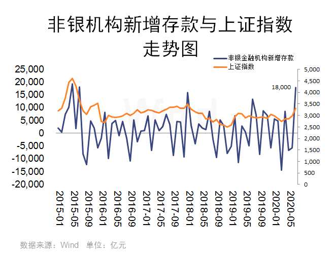 Wind數(shù)據(jù)顯示,7月非銀存款增加1.8萬億元,增量為歷史次高,僅低于2015年5月的1.94萬億元(大牛市時期)。機構分析認為,7月股市經(jīng)歷了一波快牛行情,居民和企業(yè)不少資金流入股市,證券公司客戶交易保證金增加推動非銀存款大幅增加。可以看到非銀存款變動和上證指數(shù)變動趨勢基本一致。