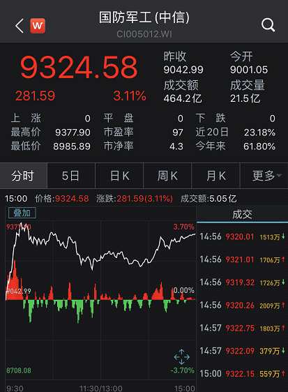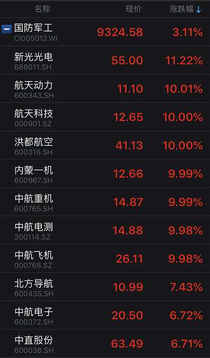 軍工股全天強(qiáng)勢(shì),國(guó)防軍工概念收漲3.11%,全天成交額464億元。其中洪都航空、航天動(dòng)力等十余股漲停;