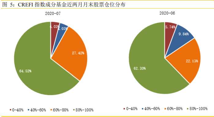 其中股票持倉(cāng)超過(guò)五成的成分基金比例為 94.35%,較上月末上升 3.37%。倉(cāng)位 80%-100%的占比大幅上升,目前股票倉(cāng)位高于歷史均值。