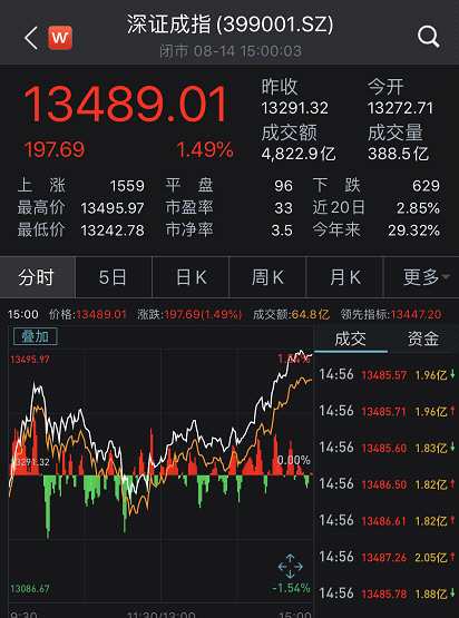 深成指漲1.49%報(bào)13489.01點(diǎn):