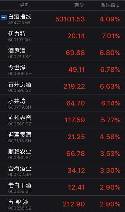 包括酒鬼酒、水井坊、瀘州老窖等集體上漲,酒鬼酒漲近7%。