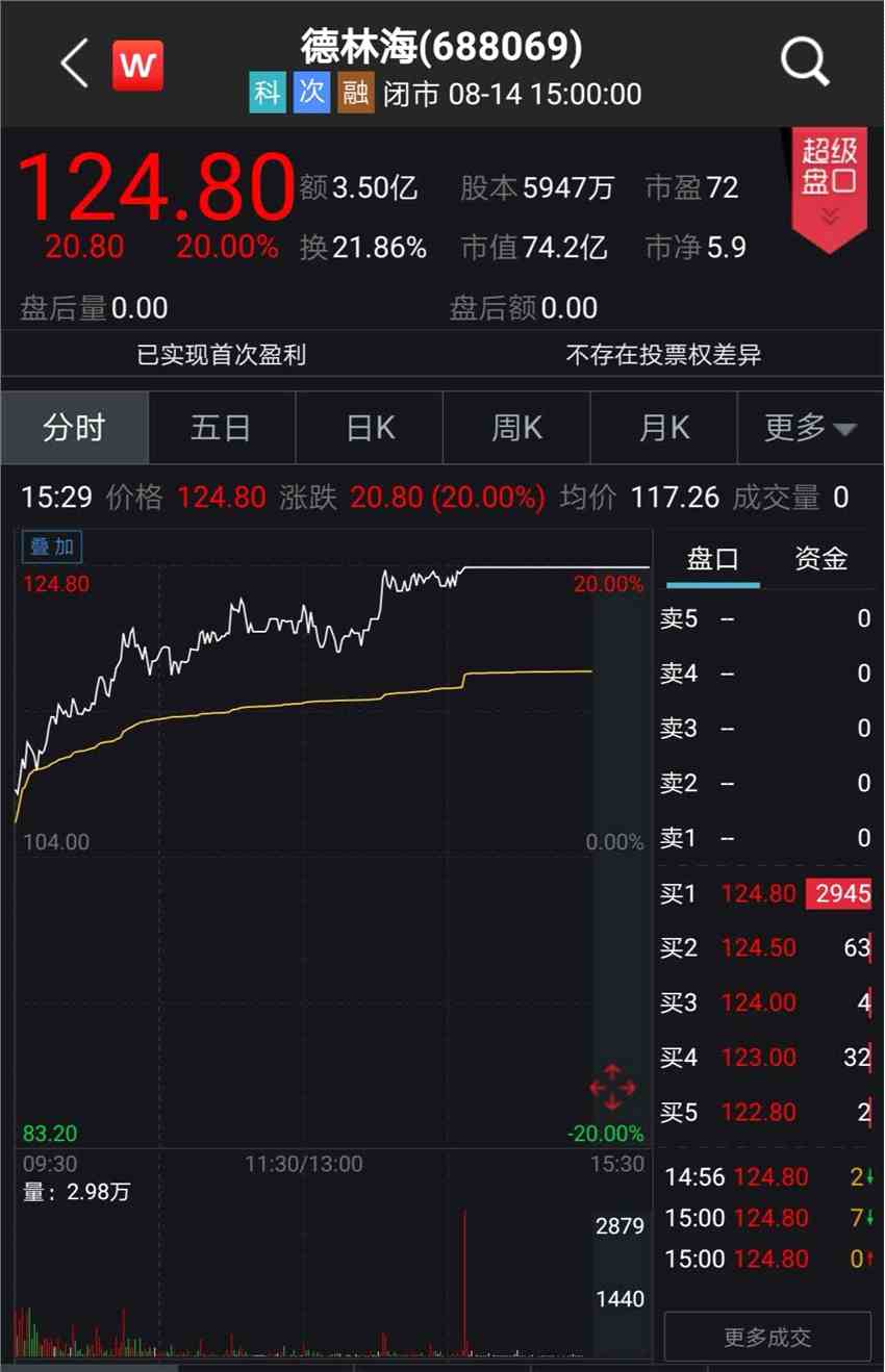 7月22日上市的德林海今日觸及漲停板,股價(jià)逼近上市首日最高點(diǎn)125元。