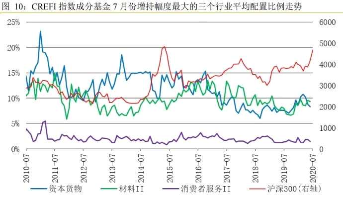 具體而言,持倉(cāng)增幅最大的三個(gè)行業(yè)為“資本貨物”(9.99%,+1.66%)、“材料 II”(10.81%,+1.48%)、“
