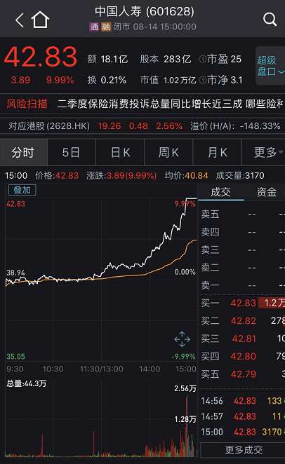 萬(wàn)億市值的中國(guó)人壽尾盤封住漲停板,主力凈流入超6億元: