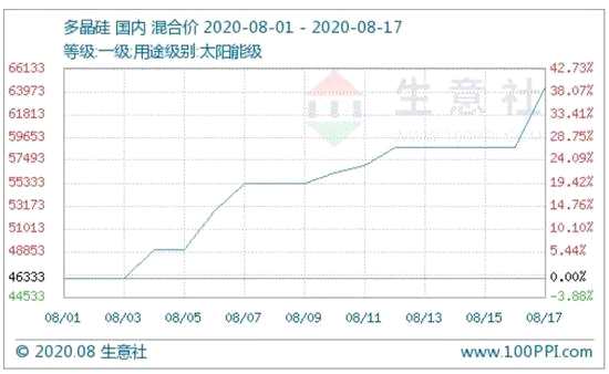 據(jù)監(jiān)測,進(jìn)入8月份以來,受供應(yīng)緊張以及下游硅片廠家采購量放大等因素影響,多晶硅價(jià)格持續(xù)上行。截止8月17日,多晶硅漲幅達(dá)38.85%。目前,多晶硅太陽能級一級料國內(nèi)市場報(bào)價(jià)已經(jīng)達(dá)到60000-65000元/噸的價(jià)格區(qū)間,進(jìn)口料價(jià)格也達(dá)到65000-70000元/噸區(qū)間。